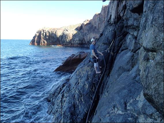 There were two cars in the carpark ahead of us, who had camped overnight. So we let them be and walked off along the cliff to get set up from the platform that leads to the gentle introduction climbs to this area. While there is a scramble down, and it is possible to boulder along the black basalt rocks at the base of the cliff we opted to rap in. The tide was low enough to make the scramble less risky, but it just seemed to make sense to rap in and save time: