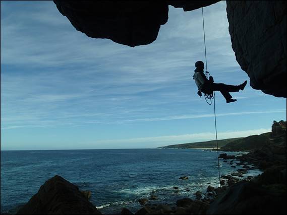 So it began again early Sunday morning. The first rap into Wilyabrup was as the morning light was taking effect, this image was later in the morning allowing a crisper image. We thought the morning may have felt crisp after it had rained all day long on the Saturday, but it soon warmed up. Better still our gamble that the rock would be dry despite all the rain paid off, at least on most routes. Each time we rapped down my trusty old, retired from leading, dynamic rope we were covered in green flecks of material that were detaching from the sheaf due to the belay devices, um maybe it is time to retire this rope: