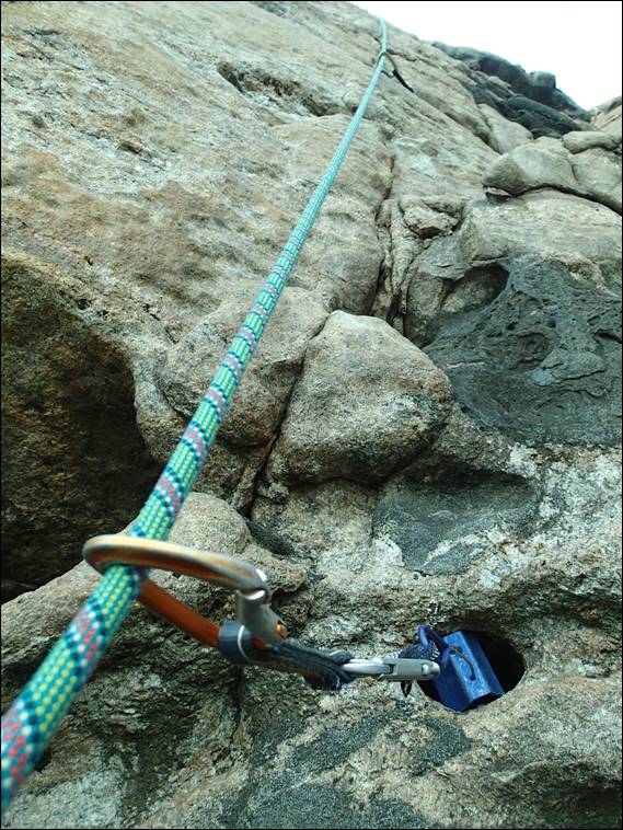 So after absorbing all this bravado from both the screen and pages I decided to take on the route, which just a few weeks back I had top roped with the intention of Wiggins doing a bit of filming. After the gentle warm up routes I stood below the wall and chatted away happily as I started up. The tri-cam I suspected looked OK, as long as I didn’t swing to the right on a fall. Then it was the committing move up to the horizontal rail, the point of no return. I mentioned that casually and in the next second pulled up to be greeted by wet holds. Fiddling gear into the horizontal wasn’t easy, I had to pull up each time on tiring arms to check it. Every time it looked dodgy: