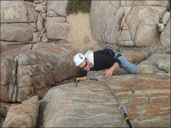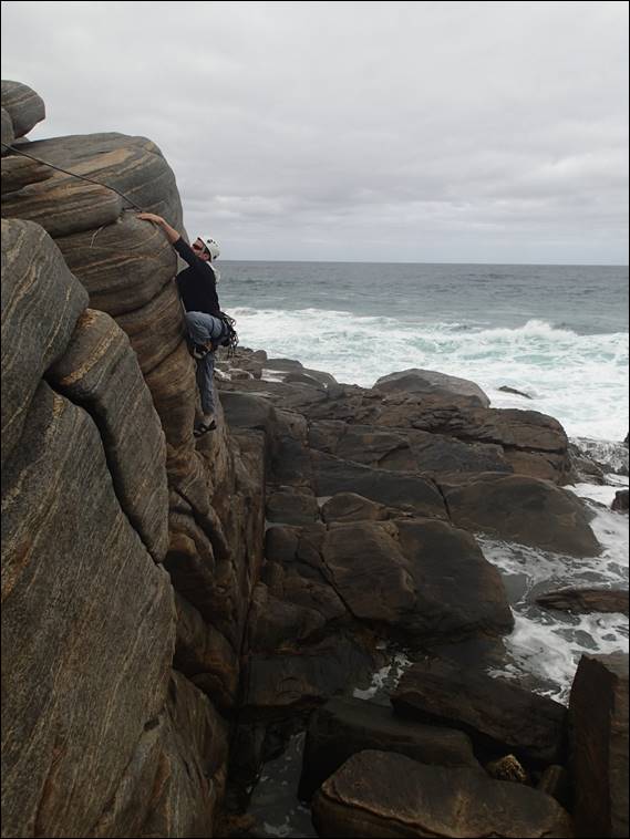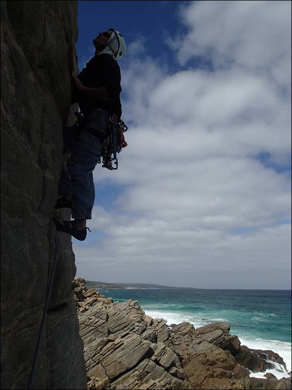 When I hit the red routes I teamed up with some guy from Brisbane, who had been stranded in Perth due to the gas works in the north being shut down because of the looming cyclone Veronica. He was tall, too tall. For every move he did I had to make two or at times three, but that pushed me and I was willing to the point that my fingertips were raw and the calluses on my soft office worker hands started to pop off. I was glad I only had just shy of 2 hours to climb before picking Elseya up! The next morning I was sore, so very sore, but I had committed to go out for a “real” climb. Craig and I plumped or Moses Rocks for a bit of ocean views and fun lines: