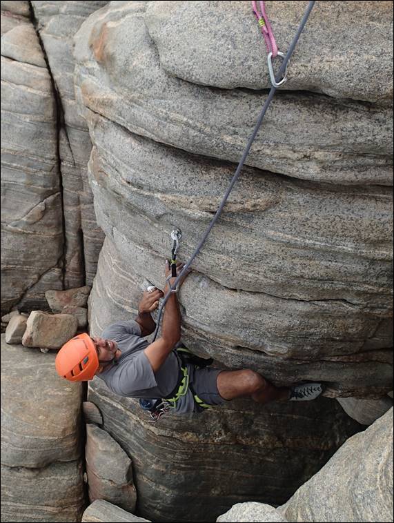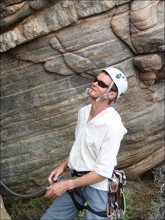 Being satisfied with his lead the rope was handed back to me. We were working our way rightwards along this broken set of small walls and buttresses, so I decided on a little number on Red Wall call Pickup. Kym put up this variation on the original route call Hickup and it is worthy line. I have to admit to once again struggling to hang on and probably climbed the route three or four times before I linked it all and topped out. Craig in his casual manner took his time and looked comfortable all the way. Too comfortable so I handed him the rope to pick the next line: