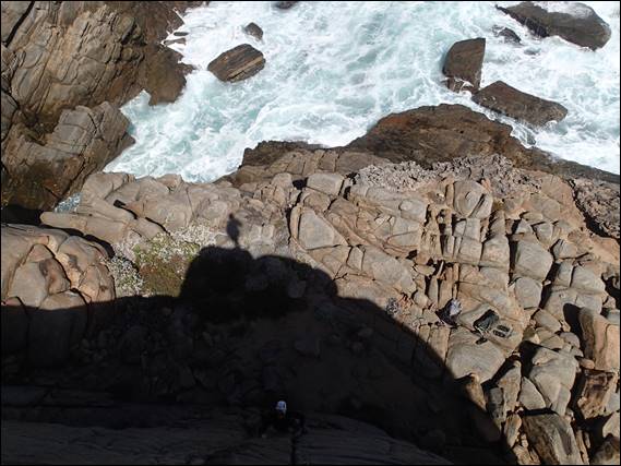 It was a low neap tide but the swell would be coming in rough, that with a seaward breeze made for great conditions. The rock was dry, none of that greasy salt spray feeling, and the friction was perfect. So we started on a little line I had been keeping an eye on to hit one day, sandwiched between two lines that Craig and I put up way back in 2009. Craig belayed from round the corner where the rock was dry and the water was hopefully not going to get him. Despite his belay perch looking dry he anchored in just in case, as I traversed in and headed up the narrow pillar: