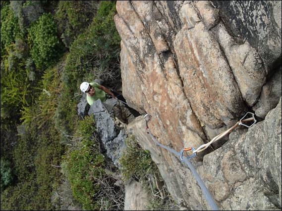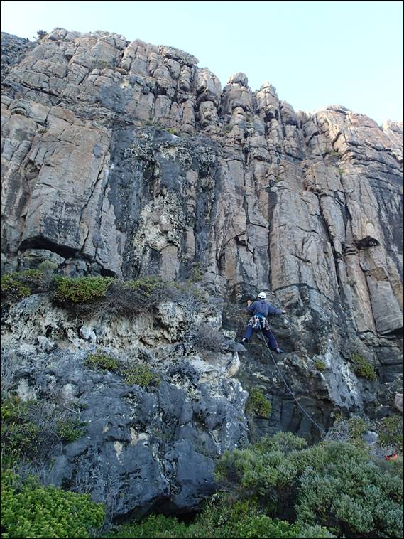 It is possible to walk to the base of this crag, but it is a bit of a bush bash and so it is much quicker to walk along the goat track along the top of the cliff. The track is a bit loose and you need to tread carefully to avoid tumbling over the edge in a few spots, all adding to the adventure of the day. To rap in I’d brought the second and shorter half of an old retired lead rope. The other half was fully retired a few months back, and this half may follow suit after this trip. This shorter half wasn’t quite long enough for today but we managed, by down climbing the last bit: