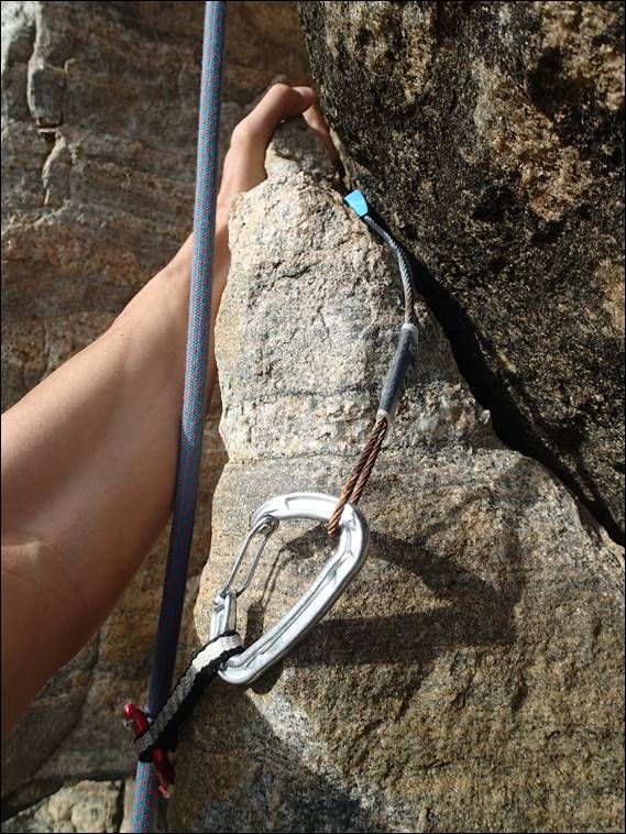 Now I mentioned earlier how we had found some crag booty for recycling and it would only be right to make use of our new piece of gear, which I have donated to Wiggins seeing he saw it first. It was only used once, by me of course, and was aptly used behind one of those creaky flakes just add extra spice on spice! In this world we really should be recycling more, I somehow doubt that Wiggins is of like mind with this particular find. I suggested a soak in some oil and it might come good, so next time you are out with Wiggins it might be worth checking his wires: