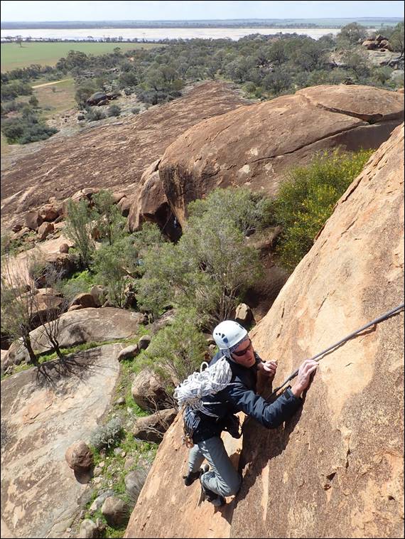 It was a bit difficult to decide which lines to start on, as we had hit the obvious warm up climbs the day before and I wasn’t so keen to jump on anything too tricky to start with. So somehow, and I still don’t know how, I managed to convince Craig to set the mornings proceedings off. It was a repeat climb from yesterday but this time he would go up on lead. Maybe he is going a bit soft in his old age, as he gave into my not so subtle hints and just got on with it. He starting in the shadows in search of the sun, making comments about the rock feeling cold: