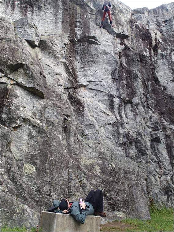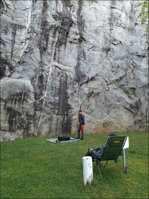 Steve settled into one of our beach chairs. Everyone who has used has used these claims they are the most comfortable beach chairs out there. From this prone vantage point he was able to enjoy the show, have a good banter and rest up as he has been instructed to since his operation. With that I was on first lead and took on the delightful Barbie Q, a fingery climb and maybe a tad feisty for a warm up climb. Mario then wanted to get take things easy and get his leading head back into shape, so jumped on This Murky Corner: