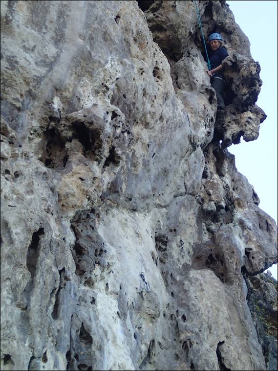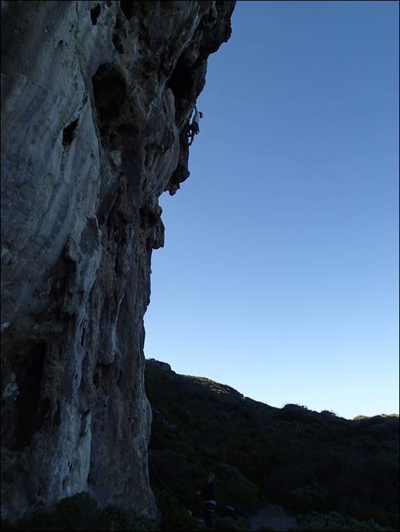 Having watched Rongy take a couple of falls, one very spectacularly, my misgivings only grew stronger. No pressure though as it was not our gear so I could come down at any time… until the owner asked if we could clean the route for him, as they were done on that line. So I set off and with the rope above me didn’t need to expend as much energy as Rongy did. I surprised myself and made it all the way to the last move before being spat off, completely and utterly gassed. It does however give me confidence to have another bash sometime, maybe on lead: