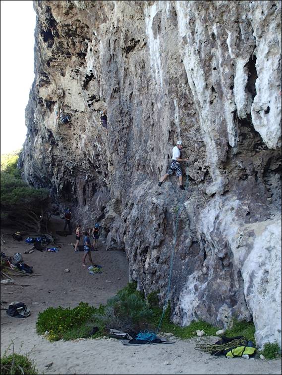 All of the equipped routes were at the far left of the crag, and we had already decided that we would be climbing at the right hand end. The reason being that the grades were more forgiving and the routes less steep. Rongy and I were convinced that Jules should lead the obvious warm-up. As she stared at the steep towering walls it was evident that we had more confidence in her ability than she did. So instead we warmed up on some of the other lines with Rongy taking the sharp end first on Stalagasaurus, which despite the runout finish never fazed him: