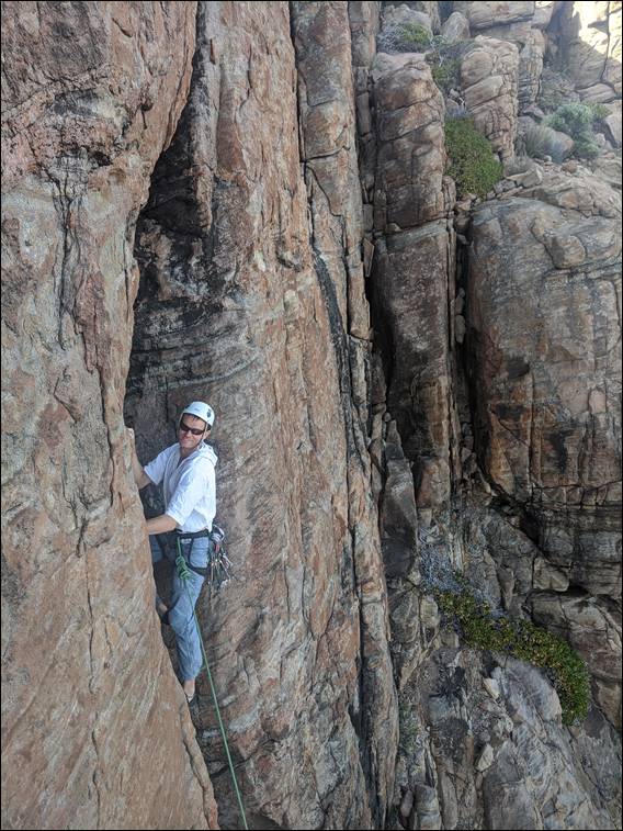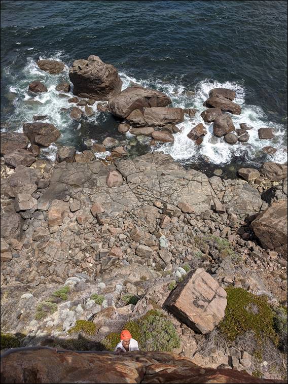 It was then Craig’s turn to jump on Banana Split, despite my many efforts to steer him to another line that I know he really would have loved. Jo Lee and Dan rapped down as Craig was entering the peapod, and as such he got to have a much better image taken of him than Jo Lee did. Craig may claim that he hasn’t climbed all that much, and that is why this was the perfect grade for him. This was however his fifth time out in a matter of months so he really can’t use that excuse any more. That said it is a pearler of line and we both thoroughly enjoyed it: