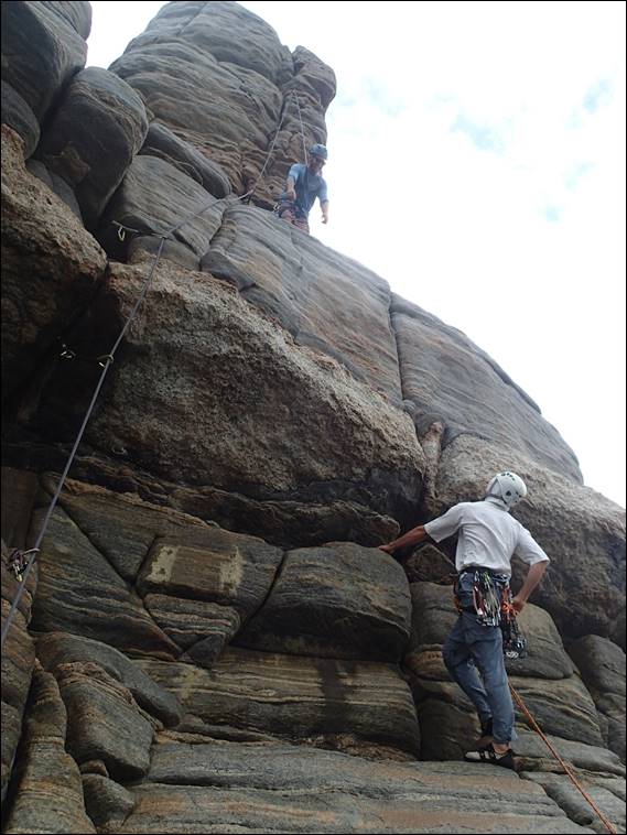 Mikey was not going slow and he was charging up Chillies and Garlic next, a very inviting looking hanging corner system. In view that I have led all these routes, several times, I had offered Mikey the chance to take every lead. Also as may be evident from my recent posts I have been getting out quite a lot, and I need to be mindful of a few injuries I am carrying. They are easier to manage while on second, so in a way we both win from the arrangement: