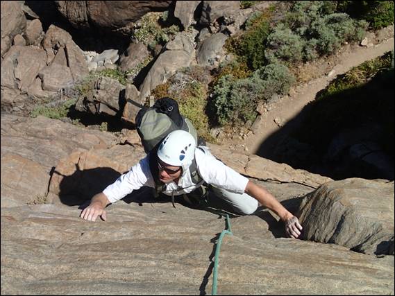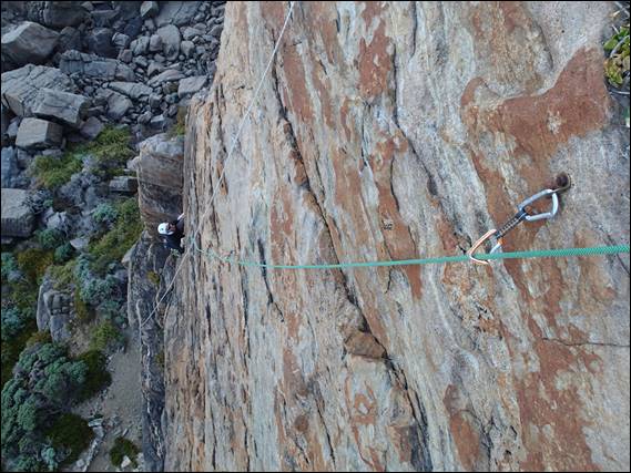 As Craig was setting off I had noticed that we only had just over an hour before we were to be walking out. As such after he had set up the belay I gunned up the route and pulled all the gear of his harness, rapping down before Howsie had even started to climb up. As we had left our packs at the base we had two choices walk out or climb out with packs, and the latter appealed more. So I decided to lead up Hope with all the gear, which was way too much, as they followed up with the packs. I sorted the gear as the other two finished off the climb and rapped down: