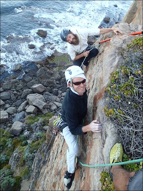 As the boys sipped tea to allow Howsie a moment to prepare, Steve dropped in on us. He had hinted that he may join us, as having started his next round of chemo just last week he was in need of exercise and fresh air. The early start and thought of harder lines on Steel Wall had not been very appealing to him, so he arrived later and had brought with him his fishing rod. His timing was perfect and the banter started, as I started to drop a few comments about needing to get ready to keep moving. Soon Howsie was racking up once again: