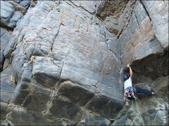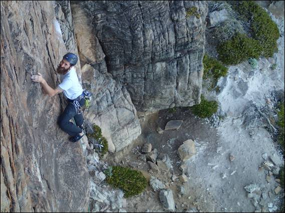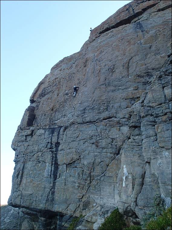 This image give you an idea of the runouts, the last piece of gear can be seen well below him just over the lip of the bulge. There is nothing of worth between that and the next piece that his eyes are fixated on, just above him. Underneath the following image I’ve decided to copy the route description for Simply Suicide, it is a route that several people lay claim to. The reason for including this description is that today the line sported one new ring bolt and there seems to be an alternate line on which another new ring bolt has been placed, muddying the history and line of this climb even further: