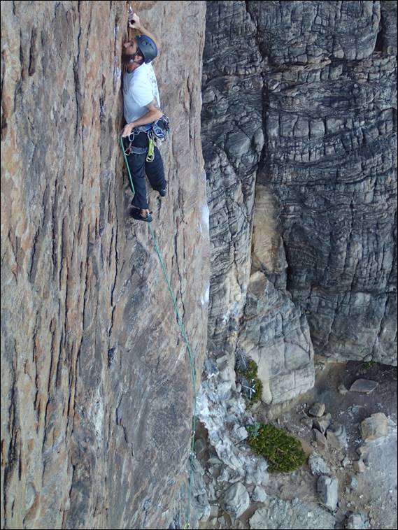 I particularly like this route as it reminds me of Swanage, a place I used to climb at along the Dorset coast in England. Towering 50m vertical walls that stretch for miles of blinding white limestone. That crag is full of corners and roofs that have the sort of exposure that you can see below Craig, as he launches for the holds above the final rooflet and the welcome belay ledge above. Once he arrived we organised the gear before Craig set off above us: