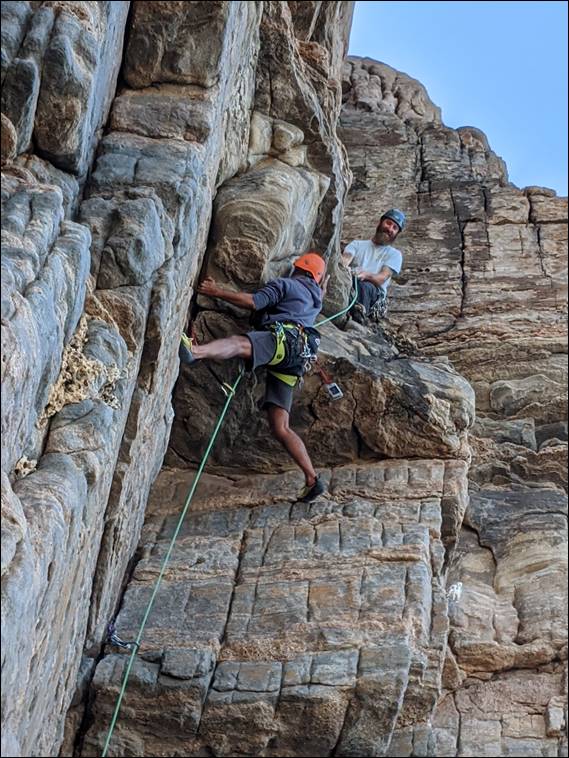 His second grade 20 to be tackled for his 2020 challenge was Mobjob. This is a very classy route, completely traditional, both in that it has no bolts and it requires tradition techniques of bridging and lay backing. It has a bit of a reputation for being hard because of this, but it really is only a grade 20. Some time back I heard mention that a hold had come off and grade was more like 21. I didn’t mention this to anyone and decided to see how things went and if I could find that broken hold: