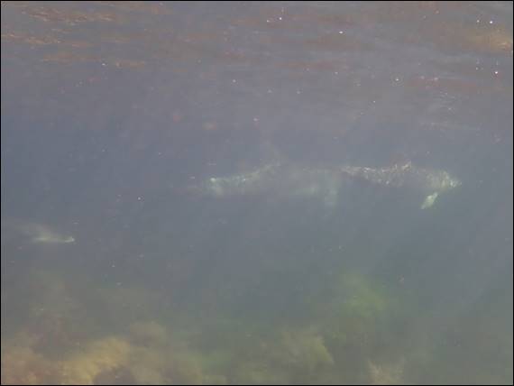 It was now or not at all this weekend, so I went in and bobbed about. The longer I stayed in the choppier it got and my snorkel occasionally took in water. It was a very low tide today and that meant I drifted out a bit further than I would normally when it is not so clear. There wasn’t much to see until I came back up from a duck dive and looked in the right direction to see a family of three dolphins effortlessly glide past me. There was a calf and two adults, no more than five metres from me but in today’s conditions the images I got aren’t that great and they quickly disappeared out of sight: