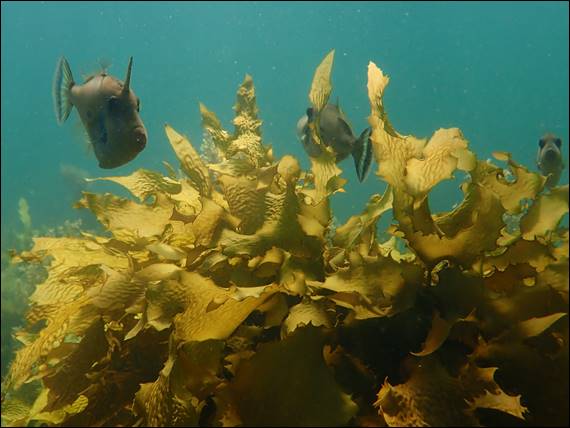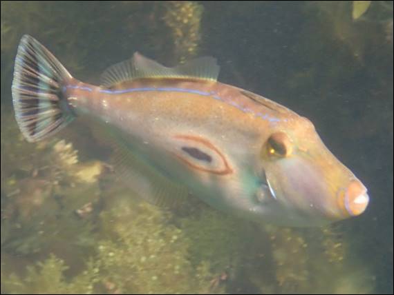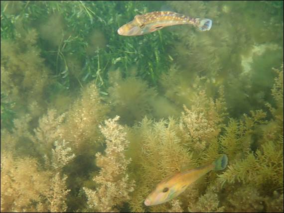 These fish can grow up to 60cm long, but I have only ever seem them at about 30cm. The dorsal spin is serrated on the rear edge, no doubt a defence mechanism but it is unclear to me why only the rear edge would be serrated. I’ve read that there is a second much smaller spine, located immediately behind the main spine, which can lock the main spin in the upright position. They were just over a nice bit of reef covered with kelp and I dived down several times checking underneath it. I found a variety of other fish hiding in dark crevices not brave enough to venture out, so I let them be and moved on: