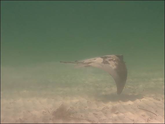 After swimming round the reef and weed for some time and seeing nothing more than the usual suspects, it was time to start heading towards the beach access track and over the open sandy areas. The dolphins had not passed by me again, or at least not while I was looking, so I was quietly hoping to see a ray after coming across both a Smooth Stingray and Bight Stingaree during my last snorkel. I was not to be disappointed, and came across a Southern Eagle Ray. The wide wings, wider than they were long, and angular raised head are clear signs of which ray this was: