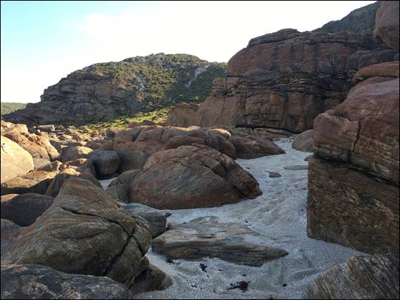 Unlike the others Lisa and I decided to walk in from the normal Wilyabrup carpark. While the car is more than capable of negotiating the access track to the crag, I’ll admit I’m not a fan of 4WDing and secondly I like the walk-in. It’s was a 40min walk from the car to the crag, but most of that is along the coast, hopping along boulders or strolling along rock shelfs. The whole way you get an undisturbed view of the ocean, the familiar smell of the weed and a great spectacle of rock architecture that varies along the way: