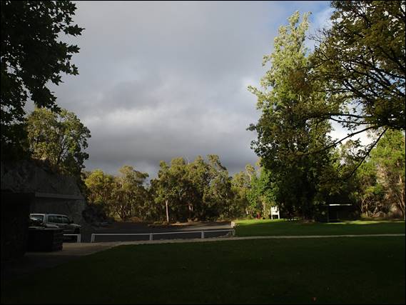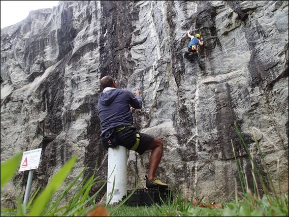 It was a mixed day, drizzle sprinkled the windscreen of the car as I drove up the hill towards the dam. As I got closer the roads had that mottled look after it had rained but not fully dried. The sky was a mixture of ominous looking clouds and brilliant blue patches. This along with the lush green of the lawn and deciduous trees made it feel like I was still in the UK. The drizzle threatened but never came down on us, nor did the humidity rise. So the rock was in perfect condition: