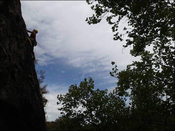 With the nagging doubt of possibly being rained out we decided to avoid the coastal climbing and do a quick trip to Welly Dam. A good call. We were bathed in dappled sunlight, as it broke through the high, white and fluffy clouds that didn’t pose any risk of holding rain. Arriving first I decided to rack up and be ready to pounce into action, and so as soon as Rongy arrived the games began: