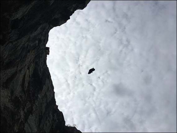 So as you’ll see above he borrowed our shoes, literally both of ours… one of each. They both kinda fitted and so he thought he would test both styles as he followed up Raging Torrent. In view of his impending surgery he was being wise and only top roping today. He made short work of this line, and then once safe at the top threw the shoes down. My memory of why is hazy, it can’t have been to crack on as both ropes were already in use: