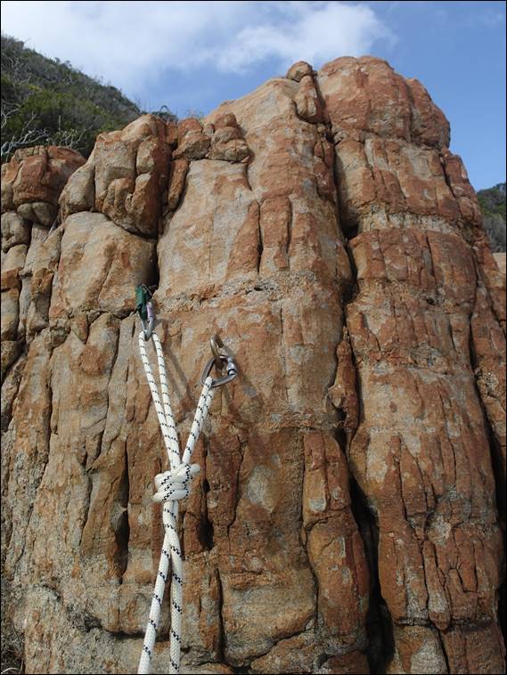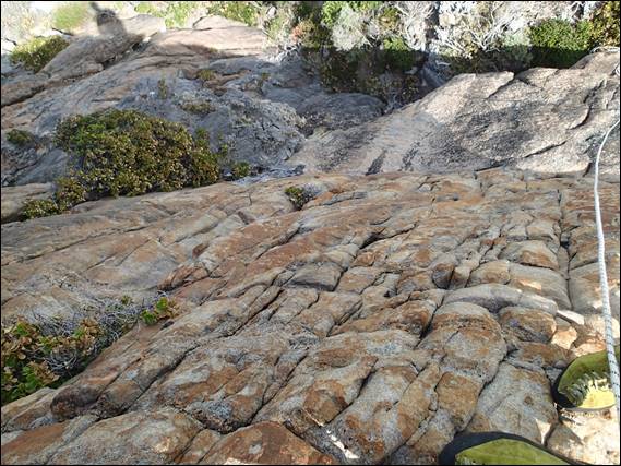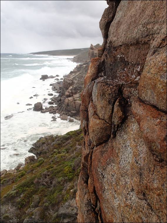 This route, when I eventually lead it is a climb of two halves. A lower coarse granite slab with a upper headwall of the more usual less textured Wilyabrup Gneiss. For some reason I have never got round to trying it. One aspect that has maybe put me off is that it just didn’t look like there was going to be much gear in the top headwall. That and the flakily and blocky look of it has also made me wonder just how many of the holds are secure. Today was however the day for it, I rapped down and as I went down I found a large loose flake that came away relatively easily: