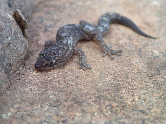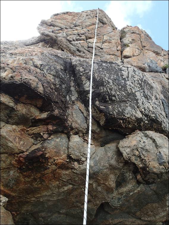 Behind the flake and still holding onto the rock I saw what I believe is a Marbled Gecko, Howsie let me know if that is right and if you can break it down into a sub-species. This image is taken from below looking up, and I felt really bad that I had just destroyed it’s home. For that reason I made myself secure and attempted to pick it up to relocate it. I needn’t have worried as it escaped my clumsy clutches and scampered across the near vertical face literally jumping across sections. Finally it disappeared into a wider vegetated crack several meters to the right: