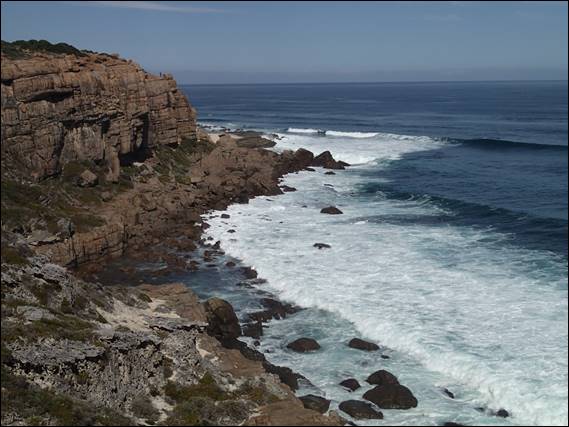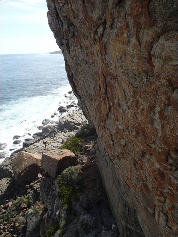 I didn’t manage the top half in a single push, and was utterly shattered when I topped out. Looking back down it was obvious that there was no point inflicting that on myself again. I’d be dogging the whole way up and might even need to resort to other unethical tactics to get up. So decision made, but I couldn’t end the day like that so I slipped down five grades and enjoyed the delights of Silver. Fingery like the first three routes and overhung like the last two, I managed a clean ascent just. One lap would do to even up the tally of the day, I was pretty happy with how it had gone on the rock. Sitting back to let my body relax, and allow that tiredness seep into every part of my body as the effects of the adrenalin dissipated. I watched the waves and noticed people stood on top of Willyabrup (above), and wondered if they had heard me encourage myself up the second last route: