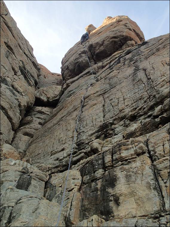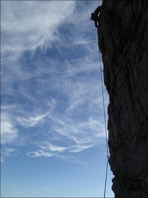 The routes we had bagged so far were no pushovers and that along with leading them made us hang on those holds that bit longer. While our forearms may have been getting a good work out we were still keen for another couple of routes. And sticking to my original game plan for the day we knew which two they would be. Rongy wasn’t so keen for lots of exposure today, so I got to lead Golden Buttress. This line is a an absolute stunner and the best trad route here, with traverses, roofs, corners, arêtes, runouts, and exposure it has it all! While I wasn’t able to see Rongy follow up, the sun was moving round as the morning wore on so I could watch his shadow as it inched its way up the very fine line: