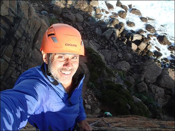 The other great part of climbing with someone else is that you are not continuously on the rock climbing or setting up ropes. Allowing a bit of time to chill in-between when you need to be on rock, giving you a chance to watch the world wake up. The sun was creeping over the hills and hitting the white horses that were riding in on the clean crisp waves. Despite looking perfect for surfing in, and while we both looked long and hard, neither of us spotted any dolphins today. As I was kicking back watching the waves and enjoying the rush of hearing them crashing into the rocks, Rongy walked up One for the Road: