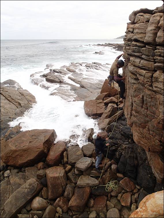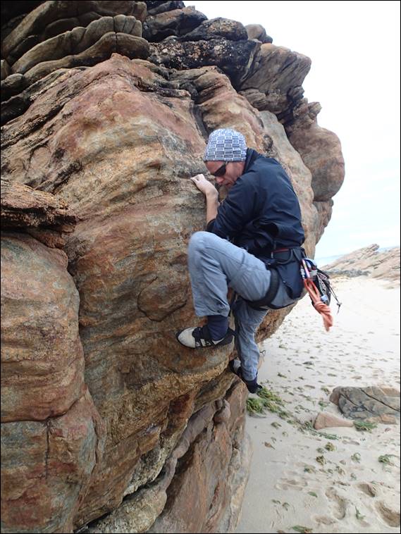 I had wondered if, with winter approaching, whether this crag would have been accessible and in condition. It is certainly one of the crags that is closer to the ocean, and with the rougher winter conditions the rock platform that is mostly dry in summer can become a tad dangerous. Today however the swell was reasonably low and there was practically no wind to stir up big waves. So while it may seem in some images, such as the one above, that we were taking a risk being here, we were never in any danger of being washed away:
