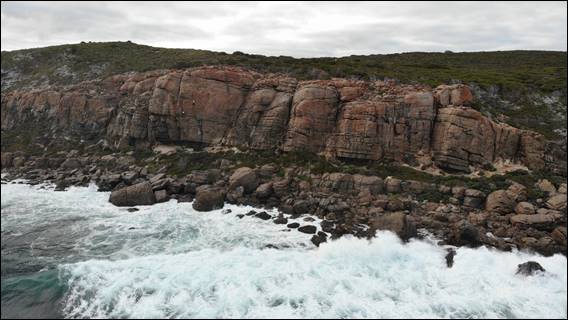 In the above image, and on the ground below us, you may see the H symbol. Signalling the landing platform, i.e. a piece of cloth, for a drone. Rhys had joined us and wanted to test out his new drone, and that meant we could get a whole new perspective of the cliff and climbing. The reduced images in this post probably won’t do them justice but they still give a great view of the setting in which the Wilyabrup cliffs are nestled. Rongy pulled off the greasy hold moves without slipping, and on arrival at the belay was keen to check out the second half of Delving Devoid: