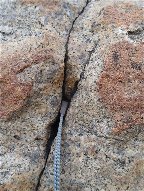 It is very much a traditional climb, a thin seam on small but adequate protection. When I say adequate protection I mean adequate for the more die hard trad climbers. Bold climbing is required. This includes having the knowledge and trust to know when even the smallest of wires, such as the one below, will hold a fall if it needs to. Watching Rongy work his way higher I felt he was being brave to take on this line considering the greasy nature of the rock, but then as I have said countless times that never seems to worry him as much as others or myself: