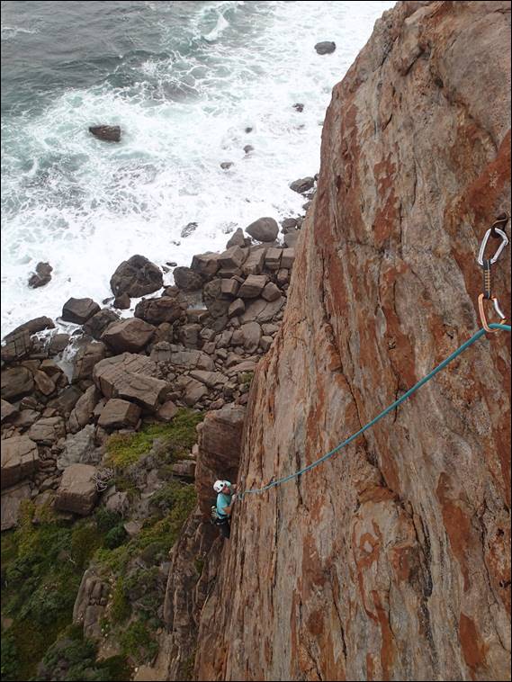 Another scramble back down to the deck, and now Rongy liked the idea of climbing Pascal’s Route. This was in part as we had bumped into Pascal, for the first time, a few weeks back and in part due to the route now sporting two new bolts. This meant that it was a on full sports route and it also took a different line to Simply Suicide from the shelf upwards. It did however mean he had to climb the first pitch of my first chosen line. A slight breeze began to stir and this helped dry the rock, making the crux moves up to the ledge that little bit more enjoyable: