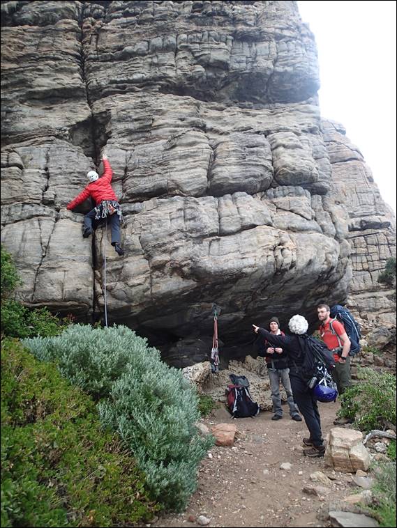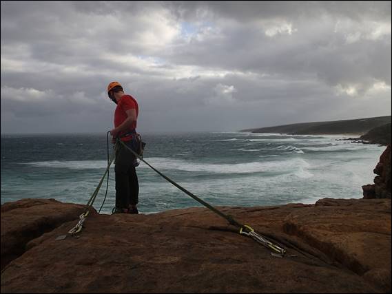 We topped out at the same time and busily got our belays set up. He was facing north and I was looking out west, and across the ocean all I could focus on was a big bank of rain. It was predicted to be fresh westerlies with a 6m swell. The wind was not that strong and seemed to be more of a south westerly, which was good as all the northerly faces were protected but this also indicated that the rain bank would head our way. The ocean also certainly didn’t give the impression of having a 6m swell, which was a shame as I was looking forward to huge crashing waves: