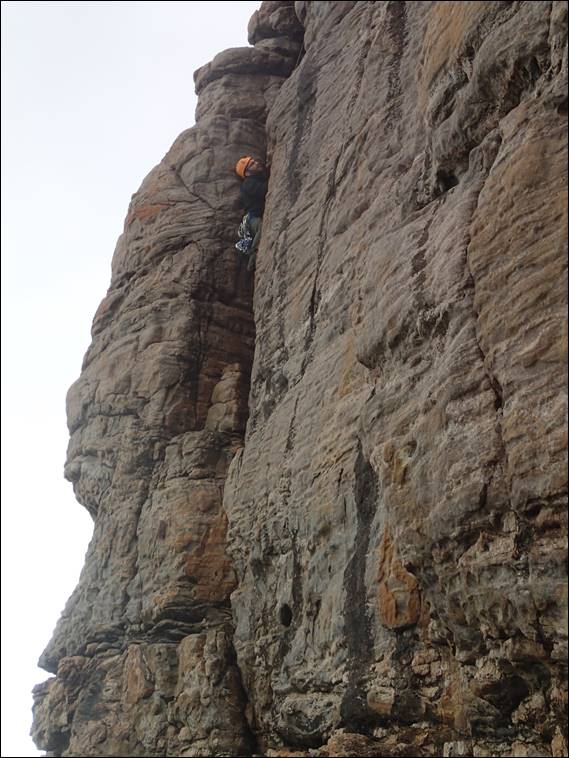After enjoying the familiar holds and sequences of Hope I discovered that despite the on and off again rain over the last few days the rock felt good. So I decided to test myself with the nervous direct start for Waterfall Second Folly. It is a steep wall with rounded holds, so friction and dry rock is important. The first gear is also tricky to place so you have to hold the positions with arms slowly pumping out. Today however it all clicked into place and I felt good, hanging there comfortably placing gear and even taking my time. I enjoyed the feeling, which is rare thing on the start of this climb: