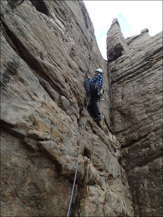 Half way up I could hear the cowbell sound of a hex being placed. Sure enough as I peeked through a horizontal break I could make out the hex as it was slotted in by Alan (above). He happened to be climbing up the other side of the huge hanging flake. Eager for a few reasonable climbs to lead and place some gear he had opted for Tom Thumb, a great choice in my opinion. A nervous start with limited protection and a traverse over some high ground, followed by fine varied climbing with lots of gear options. To round it off some would even regard exiting the crack as a steep and exposed finish: