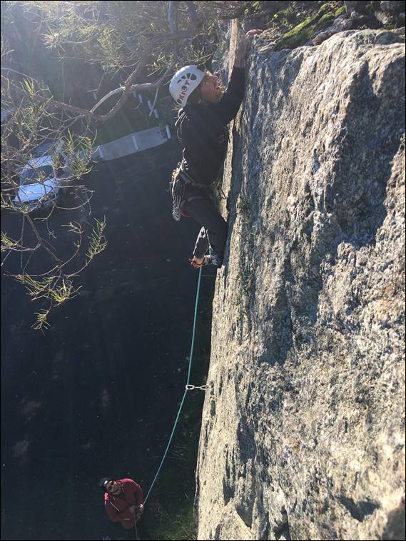 Rongy started on Irish Stew a mixed route with one bolt and a horizontal break in which you would normally place a bit of trad gear. As it was we didn’t have any trad gear with us, so he climbed the last few meters with extra care and caution so as not to risk the ground fall. As we climbed here the non-climbers found comfy perches on the rocks to the side of the slab. Content to sit in the warm sun with their books and technology. After Irish Stew it was time for Old School, which I was staggered to hear that neither Andrew nor Rongy could recall ever climbing: