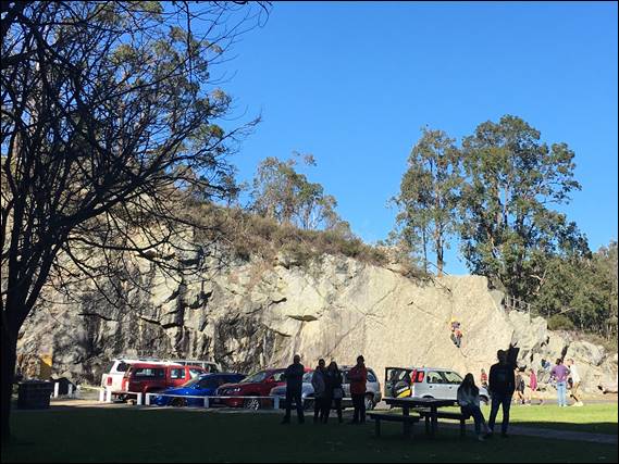 The gathering was not just about the climbing but also a social, and as such Andrew soon appeared with Lachy and Rhianna closely followed by Rongy and Alana. The last time I was here happened to be with Rongy, and the walls were all dripping wet. Today while many parts looked similarly soaked there was a lot more dry rock than last time opening up more options. Despite that and due to the big walls being in the shade and cold we opted to play on the carpark slabs in the warm sun. These don’t offer lots of routes but enough to have a bit of fun: