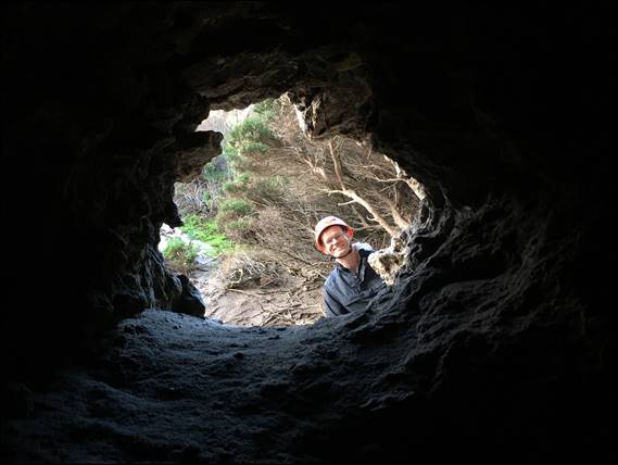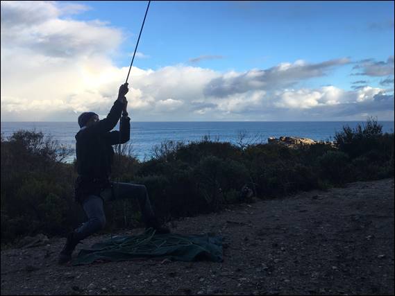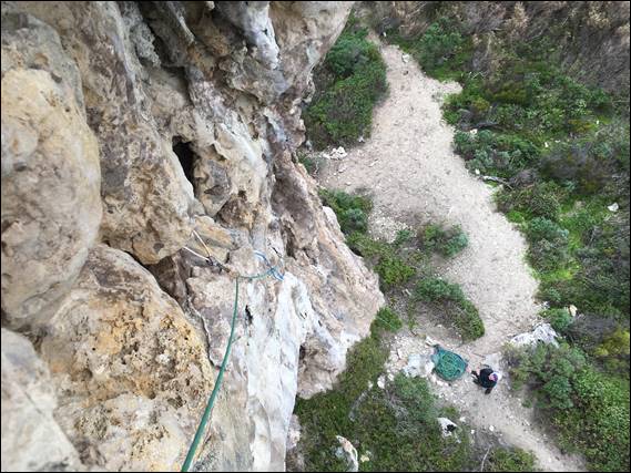 On Craig’s ascent he ducked into the big cave and tied off on one of the speleothems, a ceiling to floor pillar, so he could untie and to get rid of a huge twist in the rope. While this may seem a strange thing to do he explained later that he didn’t fancy the spinning effect that would occur if he had fallen. Craig had however been paying attention while belaying me and learnt from my mistakes. This allowed him to follow the line proper, conserve his energy and manage a clean second. When he rapped down the reason for the rope drag became more apparent, he was able to completely let go of the rope and he still came down at a very slow pace: