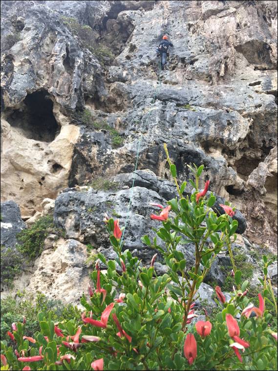 With more time up our sleeves we decided to ease the pace and climb the two easiest routes at Bobs Hollow. Unlike the rest of the steep climbs these are proper slabs. My memory of them being that they were very sharp. But after some of the routes I did on my last trip these didn’t feel that bad, or maybe they had seen a lot of ascents and the sharpness had been worn out of them. Regardless of that Craig enjoyed leading up Export Bogans, which we both agreed is pleasant but somewhat over graded. As he climbed I was being distracted by the water beading on the bright red Templetonia retusa flowers, or coral bush as it is more commonly called: