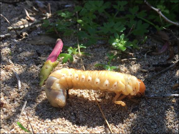 I really don’t know how we lucked it, but the walk out was in sun. We took a much more leisurely stroll that the last power-walk march out of here with Rongy. A relaxed 45min walk, as opposed to a 30min stealth mission. This allowed more time to observe things and that included all the borrows all along the footpath. Piles of dark sand mounded up with a distinct hole in the middle. I wasn’t sure what had made them, and then we came across a bug that was in the early stages of attempting to bury itself in the middle of the path. Maybe this was the guilty critter? To avoid it getting trampled on we moved it off the path, allowing me to get a close look: