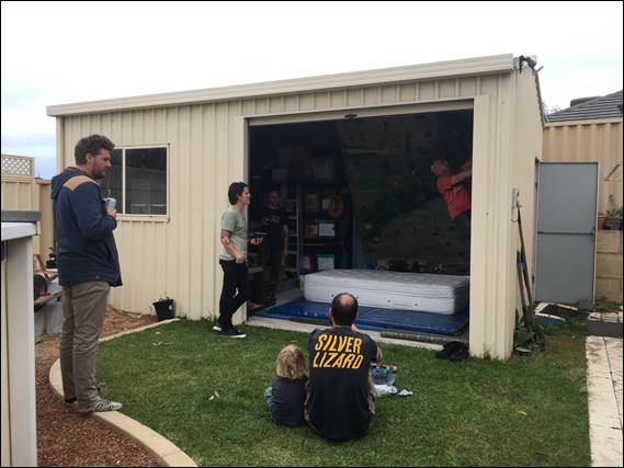 The diehard climbers stuck it out for quite a long time in the shed. Mostly Rongy, Howsie, Craig, Katie and I. Steve did a little bouldering but isn’t climbing fit and has to watch his hand, which like my old shoes feel like they are deteriorating. KC, Josh and various kids and others came and went to briefly see what was holding our attention for so long. While I was a little weary from playing on my wall in the morning I still managed to mostly hold my own. Eventually however hosting duties were beckoning Rongy away, and when the food came out one by one the others were drawn towards the aromas drifting out of the house. Until only Katie and I were left: