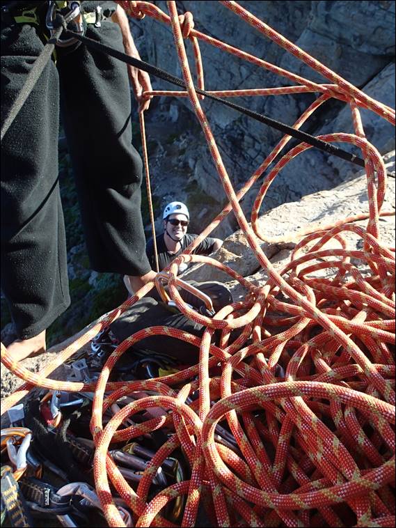 It transpired that the traverse at the start had unnerved her, and she had subsequently over gripped the whole way and pumped herself out. Rather than take her time, rest up and shake out the pump; she had doggedly climbed on until her arms were all jelly like. It seems that the lesson that should have been learnt on the last route on Steel Wall had not fully sunk in. As she flailed up the penultimate section, up the undercut arête with nothing below her but air, I looked across and Ash was casually finishing up while Glen was basking in the sun: