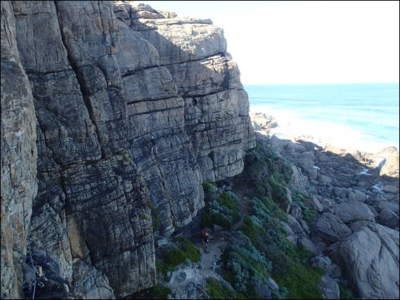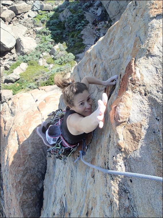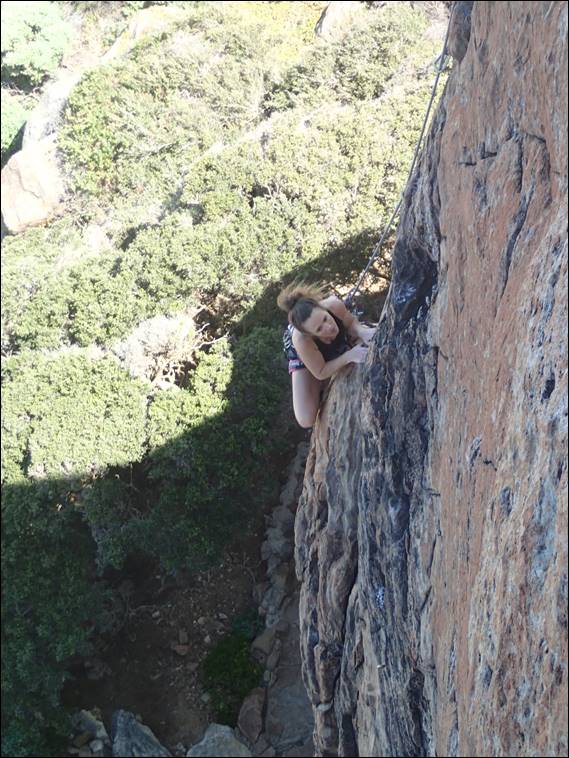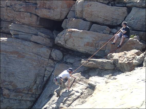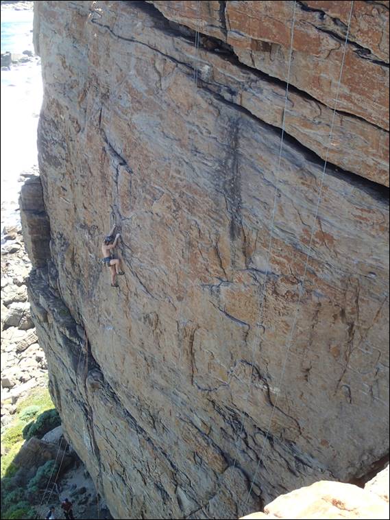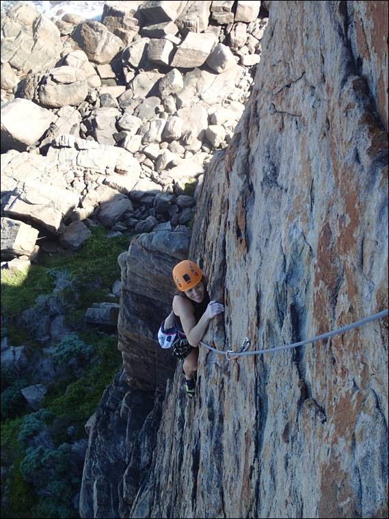 They packed up and wandered over to meet us and then continued to sit and look out to sea soaking up the sun, which was starting to get a bite to it. Jaime pleaded below for a bit of help working up the last few moves, but it wasn’t forth coming. No tight rope was yielded and it would only come if she fell, so she had to dig deep and whimpered up the final few moves with a bit of assistance with me pointing out where the best hand and foot holds were, and how best to use them. Finally she almost belly flopped over the edge with limp arms unable, or unprepared, to respond to any command her brain sent them: