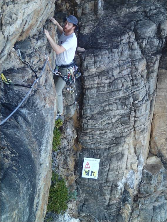 Glen went off to lead First Climb, above. Any aptly named route considering it is his first lead climb in a very long time. Meanwhile I had plans to get Ash to jump on the pointy end, so I romped up the first pitch of Sirius. This would allow me to see how his head was going, as being a traverse the person coming up second is at risk of taking just as much of a fall as the leader. Before we started he was hinting at nervousness and being unsure about the prospect. Then as he followed me I could hear statements about his arms pumping out, while his face showed complete and intense concentration: