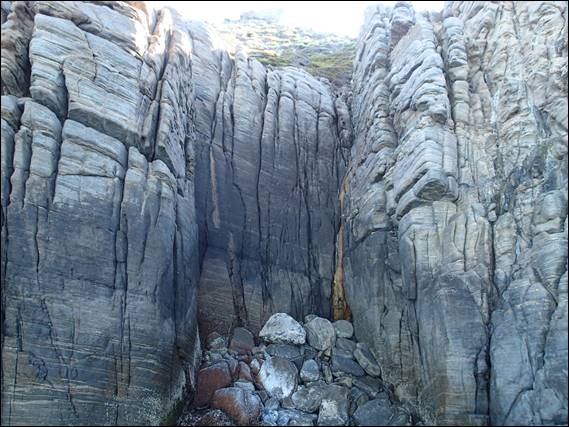 Before we had started climbing and as we walked in, I showed Jaime a few of the areas that offer a surprising diversity of climbing at Moses. I’d already checked before and knew it was going to be a low swell and very low tide, raising my hopes of getting into the Zawn. But it all depended on the condition of the rock and whether Jaime was OK with it. As the images show she was up for it, and after just one route on Hand’s Up Wall we were scrambling down into the Zawn to get even closer to the ocean: