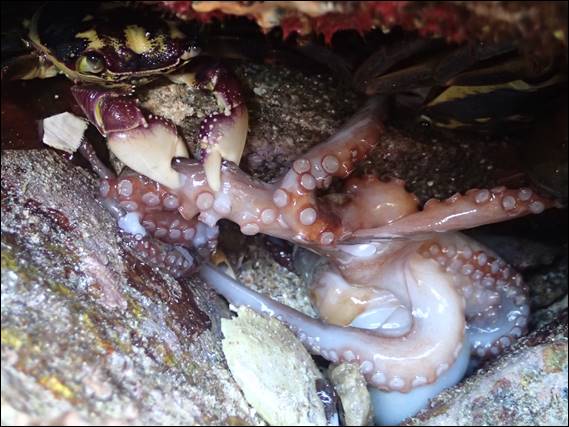 While we were lucky with the conditions today, we did come across a baby octopus that was not so lucky. I thought it was alive as it slithered into a crevice, looking like it was trying to hide from me as I approached. It was in fact being dragged down by several crabs who had a secure hold of its tentacles, and were showing no signs of letting go. I was a little surprised as I always viewed the octopus to be the predator and the crabs to be one of their prey, but I guess this one had not had the chance to get big enough before that was the case: