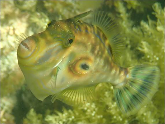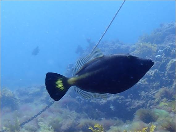 Another fish that caught my eye was this Yellow-striped Leatherjacket, of which there were two that swam round together near where the anchor lay. The male with the orange patch, and the image below of the female with a yellow patterning on the caudal fin (tail). Both were displaying the giveaway yellow strip down the side that tapers towards the eye and slowly moulds into the dark ash grey body. They are very elegant fish with striking features and clean lines: